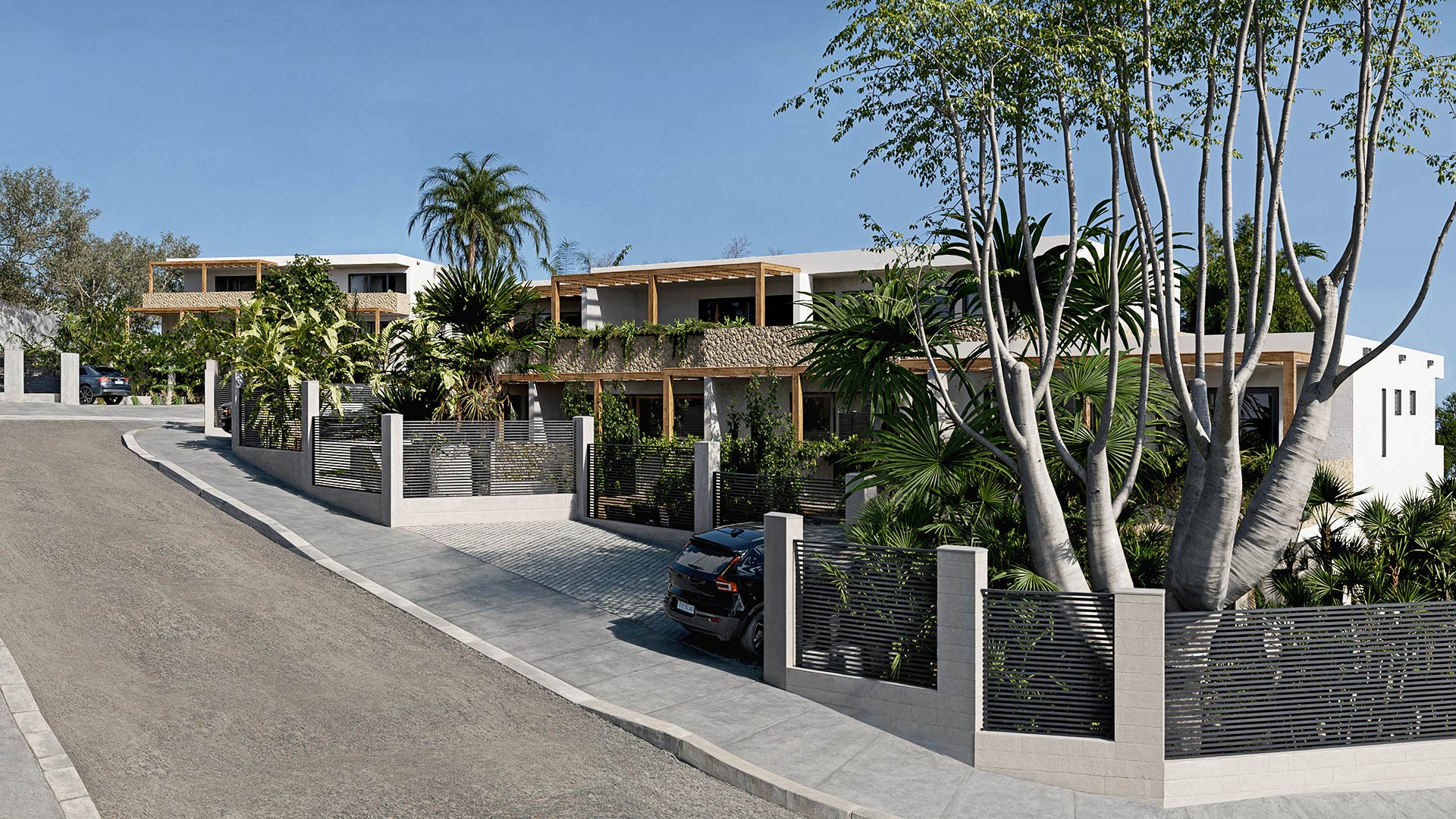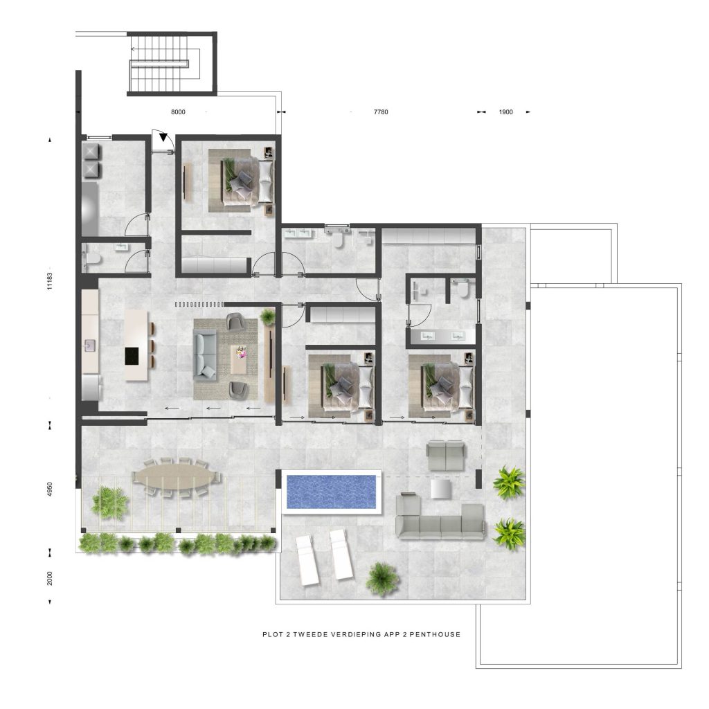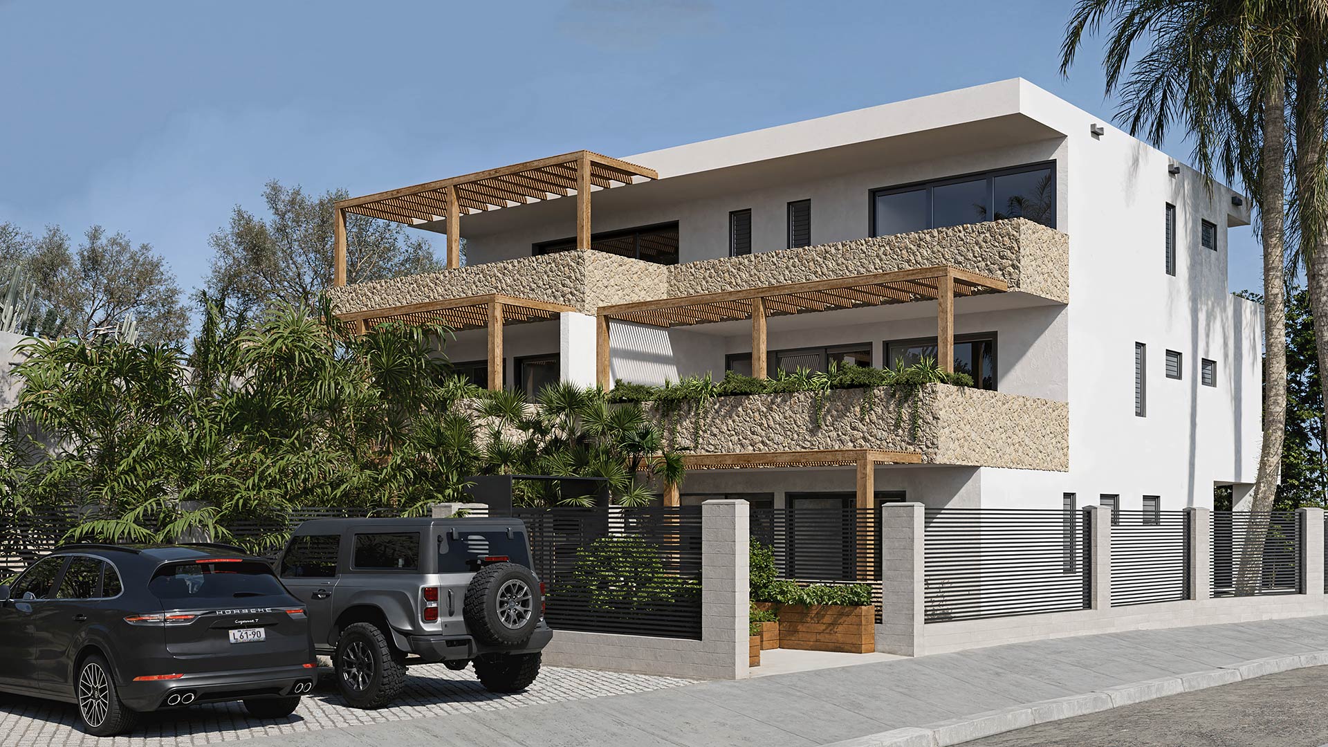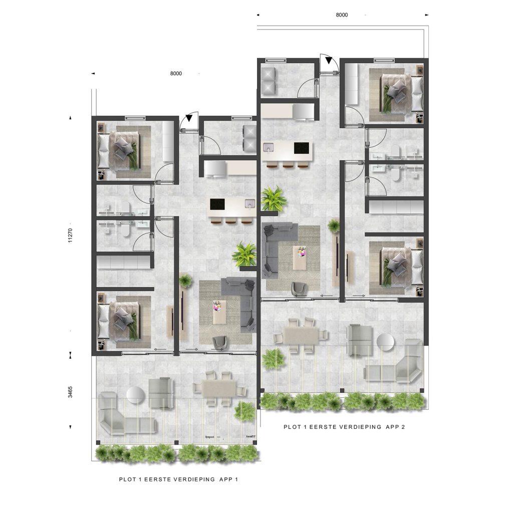Each apartment features a spacious living room, an open kitchen with a breakfast bar, two bedrooms, each with its own bathroom, including a master bedroom with a walk-in closet, and an indoor storage area.